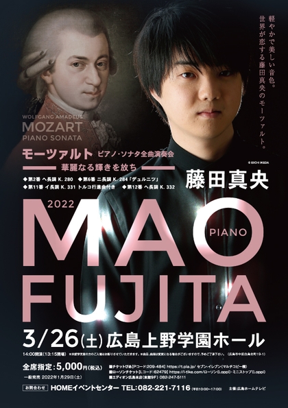 広島ホームテレビ(所在地:広島県広島市、代表取締役社長:三吉 吉三)は、主催で2022年3月26日(土)「藤田真央 モーツァルト・ピアノ・ソナタ全曲演奏会~華麗なる輝きを放ち~」を広島上野学園ホールで開催いたします。