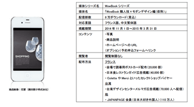 本イベントは、JAPANPAGEプロジェクトが提供するジャパンブースへの参加およびフランス語の電子カタログ「WowBook職人技×モダンデザイン編(仮称)」をセットにしたJAPANPAGEパッケージを購入していただくことで参加が可能です。