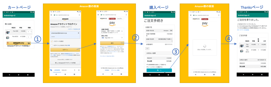 Webview*2にて対応するケースもございますが、Webviewはセキュリティ上の理由でAmazon Payではサポート非対象であり、WebViewで実装されているモバイルアプリは、そのままではAmazon Payを安全に導入いただけません。