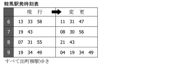 今回の変更は、同日に実施される京阪電車のダイヤ変更に合わせて実施するもので、主に「平日ダイヤ」における朝ラッシュ時間帯及び「平日ダイヤ」「土曜・休日ダイヤ」における夜時間帯の出町柳駅での接続を調整した内容としています。