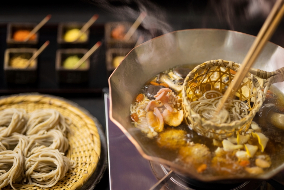 信州では、古くより寒い冬を越すために保存食として食材を発酵させる文化が根付いています。食材を長期保存させるのみならず、栄養価も高める発酵食品。鍋のベースとなる出汁に、赤かぶの葉を乳酸発酵させてつくる信州の郷土食「すんき漬け」や、味噌を熟成する際に分離してできる発酵調味料「味噌だまり」などを入れることで、奥深い味わいに仕上げます。鍋の具材は、エリンギや淡いサクラ色のトキイロヒラタケ、鮮やかな黄色のタモギタケなど、食感や香り、味わいが異なる数種類のきのこと、松の実や胡桃入りの鳥団子と牛肉です。また、クコの実や高麗人参などの生薬を入れることで、栄養価を高め身体が温まる鍋になります。食事の最後は、とうじかごを使用し、きのこの旨味が溶け出した出汁にくぐらせて仕上げる蕎麦です。信州の恵みを存分に詰め込んだ滋養豊富な鍋を食し、美味しく免疫力を高められます。