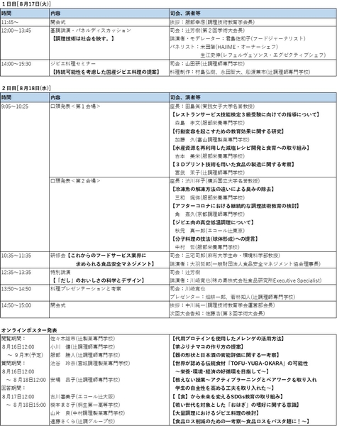 調理師学校教員による研究発表に加え、トップシェフによるパネルディスカッション、調理技術デモンストレーション、ジビエ料理セミナー、研修会などが行われます。