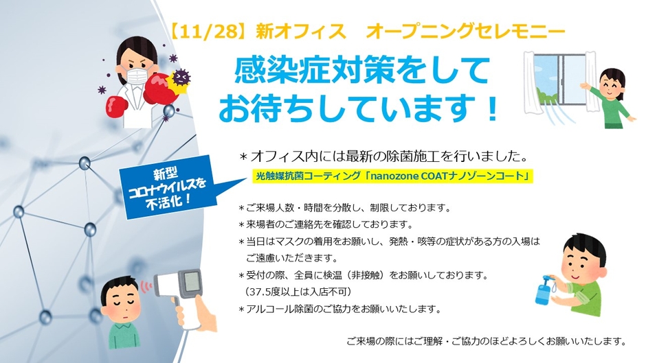 11/28(土)に自由が丘新オフィスで開催するオープニングセレモニーでは、皆様に安心してご来場いただけるよう感染症対策を徹底しております。