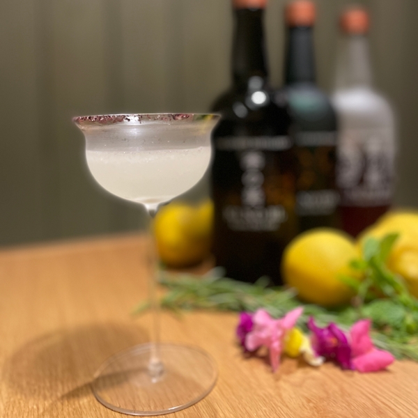 ギムレットの力強さにKABEAT自家製のレモネードを加えることで、繊細でやわらかいハーバル感を感じられる。グラスの縁に赤紫蘇のふりかけを使用。