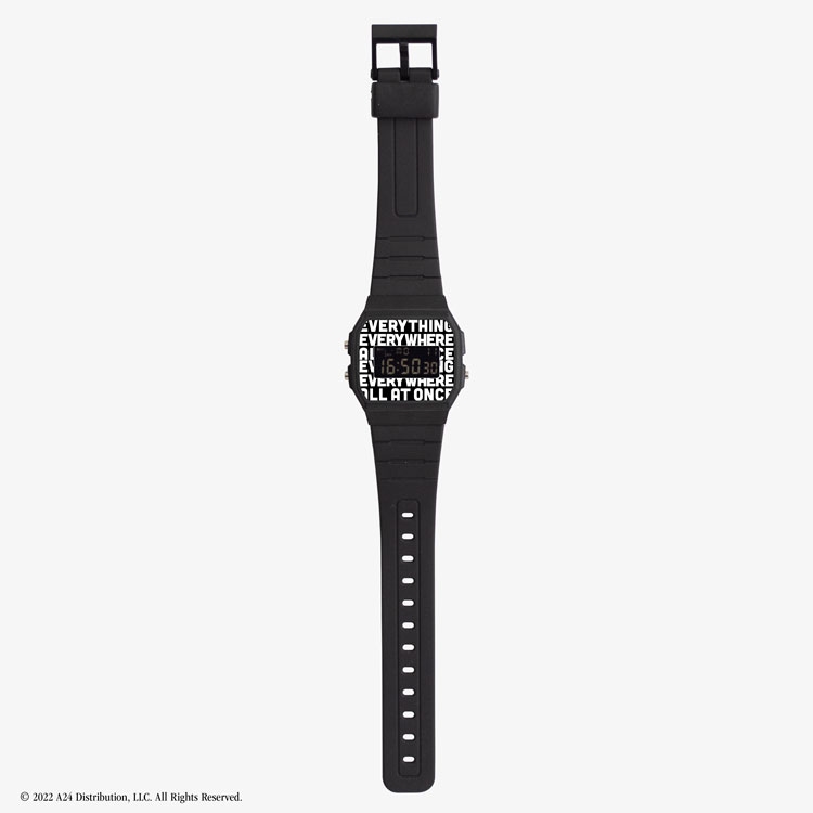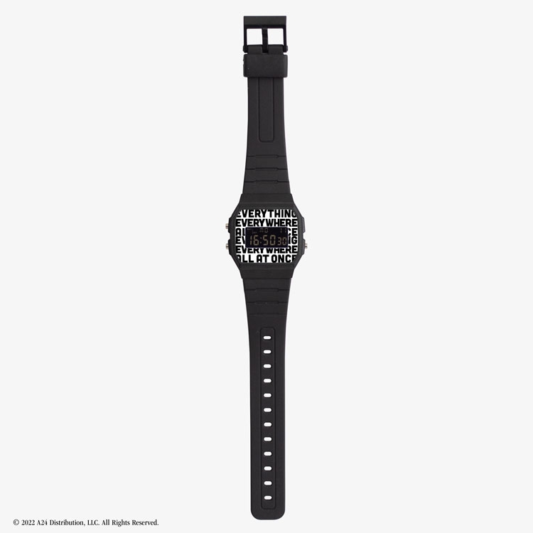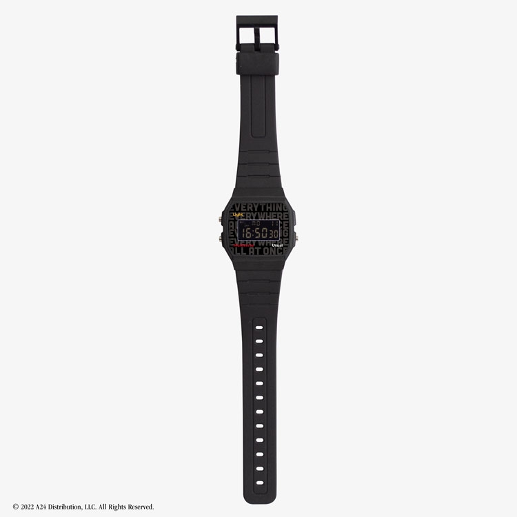 そんな、全世界でいま最も注目を集めている映画『エブリシング・エブリウェア・オール・アット・ワンス』とのコラボアイテムは、ロゴを配したデジタル腕時計や、スウェットパーカ、PHONEストラップなど計7アイテムを発売します。
