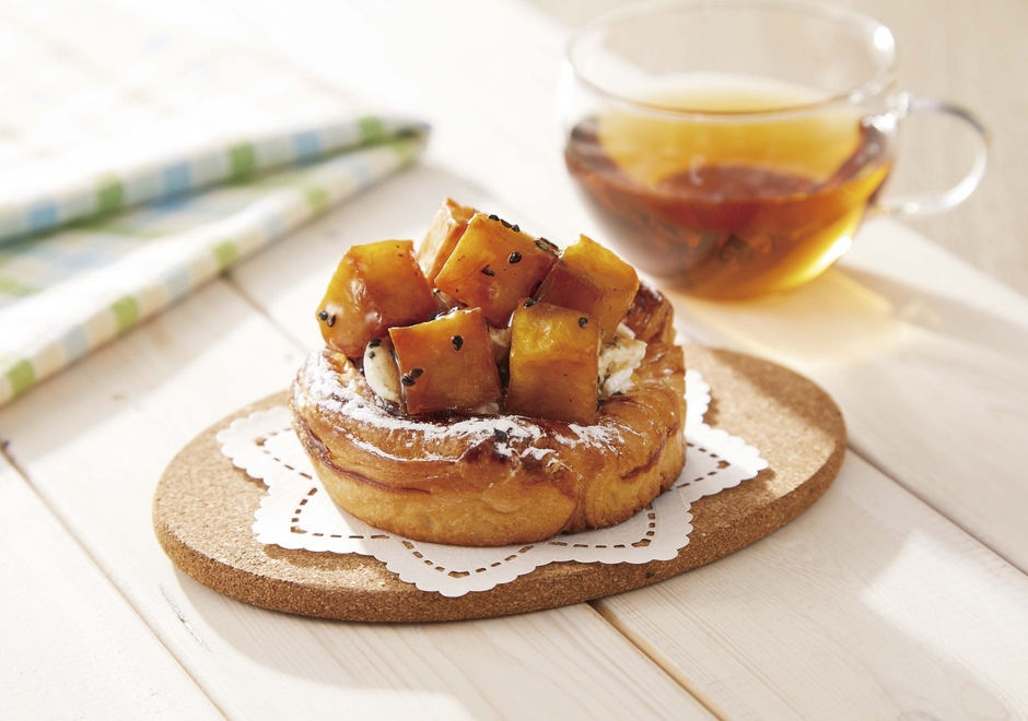 カリカリの飴でコーティングしたごろごろの大学いもとサクサクのデニッシュが相性抜群です。見て満足、食べて満足の秋のスイーツパンに仕上がりました。