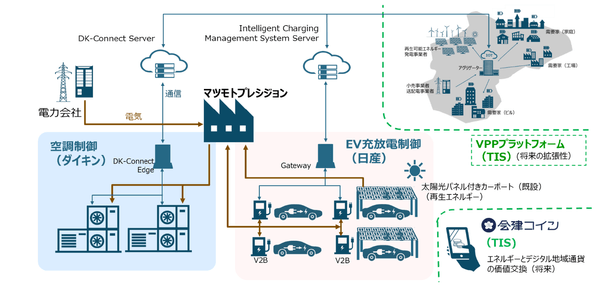 さらに、今回の取り組みをベースに、将来のVPP※プラットフォームとしての活用を目指し、TISのICT基盤技術を組み合わせたデータ解析や検証も行います。また、エネルギーの効率的な利活用においては、EV使用者の積極的な参加が不可欠であり、会津地域で利用可能な地域通貨「会津コイン」と連携し、電力ひっ迫時にマツモトプレシジョン従業員のEVから電力供給をした場合に、「会津コイン」のポイントを付加する仕組みの導入も検討しています。