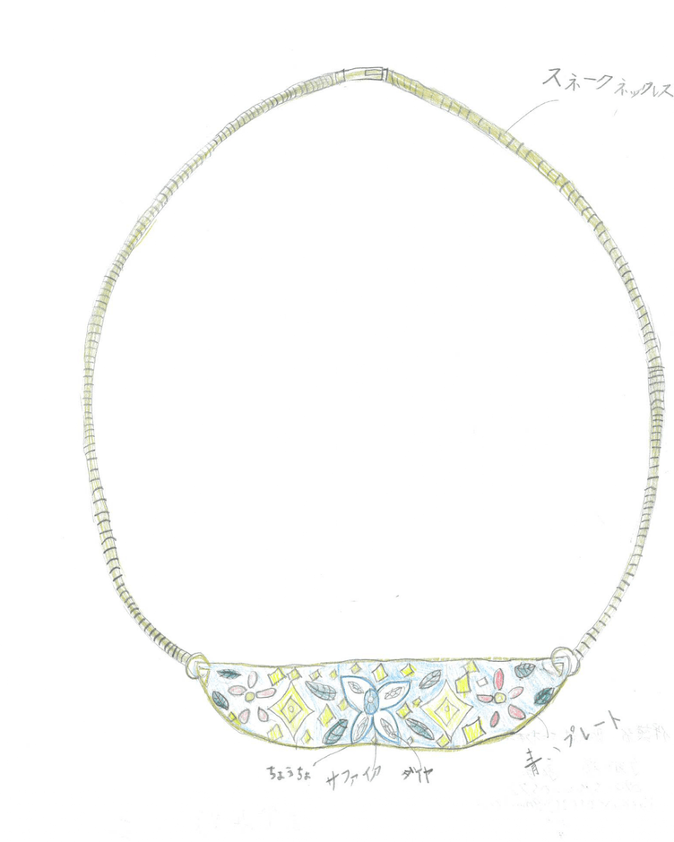 受賞理由:ジュエリーに付いている宝石は、爪で留められるものがほとんどですが、このネックレスは「あえて宝石は固定せず動くことで輝きを与え」ており、様々な角度から宝石の輝きや美しさを感じることができます。まさにこれまでの考え方を「180度変わるような」新しいデザインであると思います。