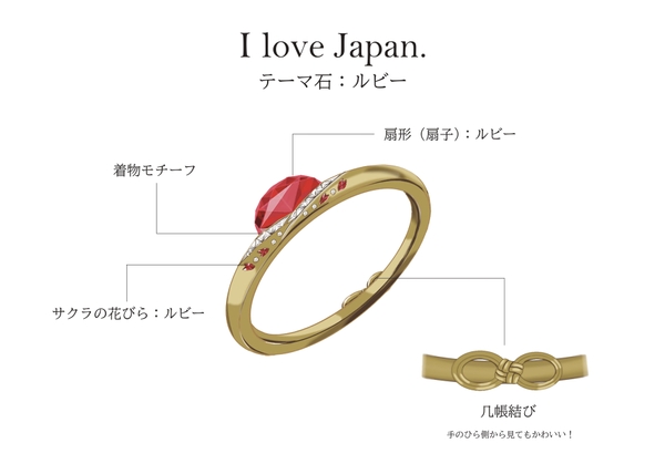 りながらも、ルビーの美しさを感じることができるデザインです。他にも着物・サクラの花びら・扇子をモチーフにしており、日本人の美徳を感じることができます。