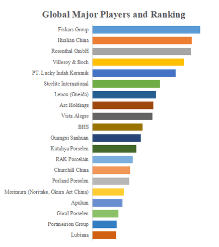 YHResearchのトップ企業研究センターによると、セラミック食器の世界的な主要製造業者には、Fiskars Group、Hualian China、Rosenthal GmbH、Villeroy & Boch、PT. Lucky Indah Keramik、Steelite International、Arc Holdings、Lenox(Oneida)、Vista Alegre、BHSなどが含まれている。2023年、世界のトップ10企業は売上の観点から約4.0%の市場シェアを持っていた。