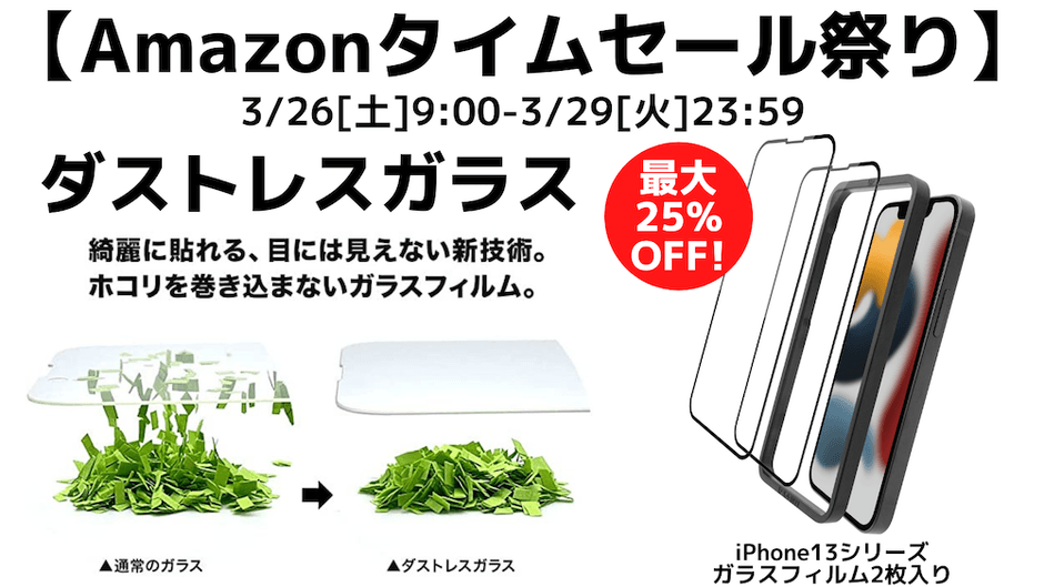 【Amazon限定ブランド】「Toride(トリデ)」は、ネット通販サイト「Amazon.co.jp」にて、明日3月26日(土)から3月29日(火)まで開催される「Amazonタイムセール祭り」にてiPhone13 / 13 Pro / 13 mini / 13 Pro Maxでご利用いただけるガラスフィルム2枚組を最大25%OFFで販売します。