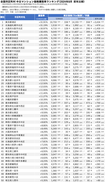 全国市区町村 中古マンション価格騰落率ランキング(2024年8月_前年比較)