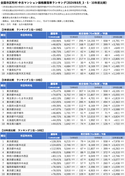 全国市区町村 中古マンション騰落率ランキング(2024年8月_3・5・10年前比較)