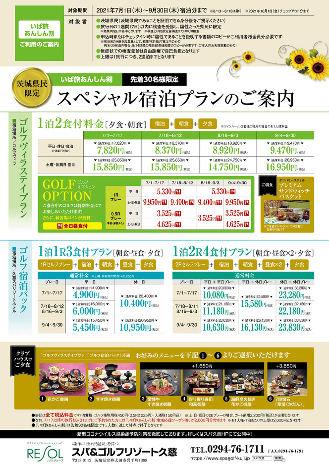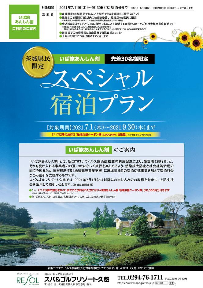 「スパ&ゴルフリゾート久慈」では、2021年7月1日以降にお申込みのお客様を対象に、支援金を活用して割引いたします。なお、7月17日以降の旅行を8月31日までにご予約さらえた方には『いば旅あんしん割 地域応援クーポン券』が2,000円分付与されます。