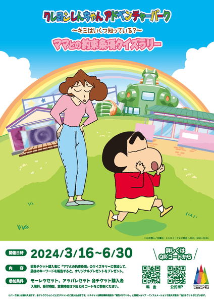 兵庫県立淡路島公園アニメパーク「ニジゲンノモリ」の大人気アトラクション「クレヨンしんちゃんアドベンチャーパーク」では、野原しんのすけと母・みさえが交わした「ママとのお約束事項」をテーマにした、アトラクションエリア内に散りばめられたクイズを探し歩いて解決するクイズラリー『キミはいくつ知ってる?ママとのお約束条項クイズラリー』を3月17日(土)~6月30日(日)の期間限定で開催いたします。今回のクイズは過去最高難度のクオリティ!すべてのクイズを解き明かした方には「クレヨンしんちゃんアドベンチャーパーク」オリジナルステッカーをプレゼントいたします。