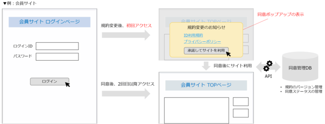 同意管理用のデータベースを用意し、規約のバージョン管理や同意状況の管理を行います。ユーザーがアクセスした際には、APIを通じて最新の同意状況に照会をかけることで、個別に情報の出し分けが可能となります。