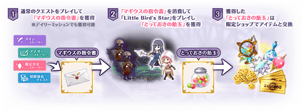 「マギウスの指令書」を消費すると本イベントのクエストをプレイでき、限定アイテムや覚醒素材と交換できる「とっておきの飴玉」を獲得できます。