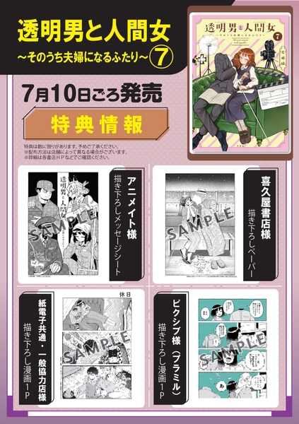 TVアニメ化に先駆け、7月10日(木)ごろ発売の『透明男と人間女~そのうち夫婦になるふたり~』第7巻のカバーは”撮影現場”をイメージしたイラストとなっており、仲良く寄り添う“ふたり”の姿が目印です。
