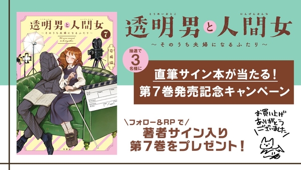 pixivコミックでは『透明男と人間女~そのうち夫婦になるふたり~』7巻発売を記念し、7月7日(月)より7日間限定で、同著者最新作『狐面夫婦』と合わせ、ダブルで全話無料公開!
