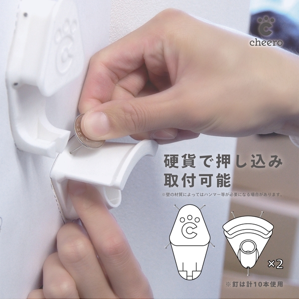 製品本体の穴は、壁に対して斜めに釘が入るように空いています。製品本体を壁に当てて、硬貨等で釘を押し込んでください。(壁の材質によってはハンマー等が必要になる場合があります。)