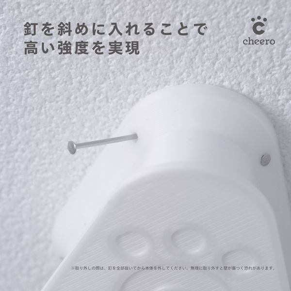 市販の画鋲より細い釘を使用し、壁面に対し斜めに釘を入れるので、取り外した際の針穴が目立ちません。また、複数本の釘を使用することで強度も確保しました。
