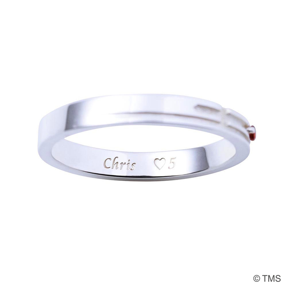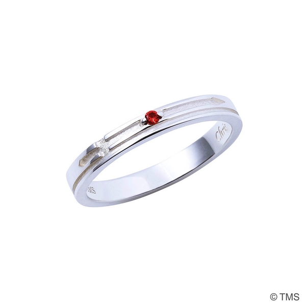 平打ちタイプのリングにラヴ&ピースの刀の柄を取り込み、イメージカラーストーンをセット。