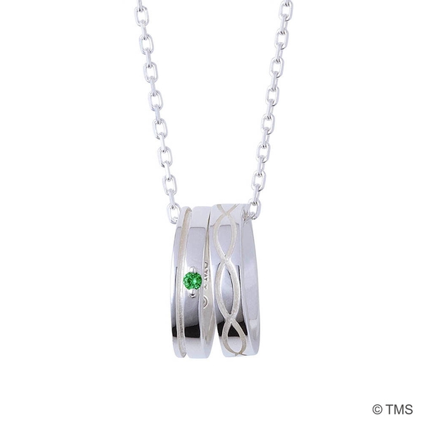 トップのリングにはグリーングリーンのマークを取り込み、もう一方のリングにはイメージカラーストーンをセットした、