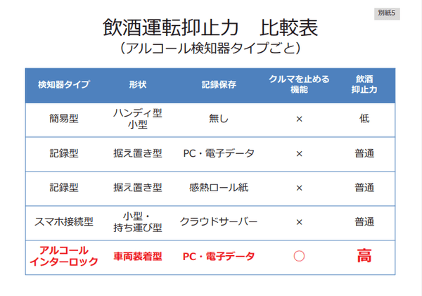 当社は、2009年9月から、運転前に呼気検査を行いアルコールが検知されるとエンジンがかからない飲酒運転防止システム「呼気吹き込み式アルコール・インターロック」を販売しています。現在、アルコール検知器は多種多様なものがありますが、「運転前に必ず呼気をチェックし記録を残し、検知したらクルマが動かない」、このような強制力のある検知器は、アルコールインターロック装置だけです(別紙5)。