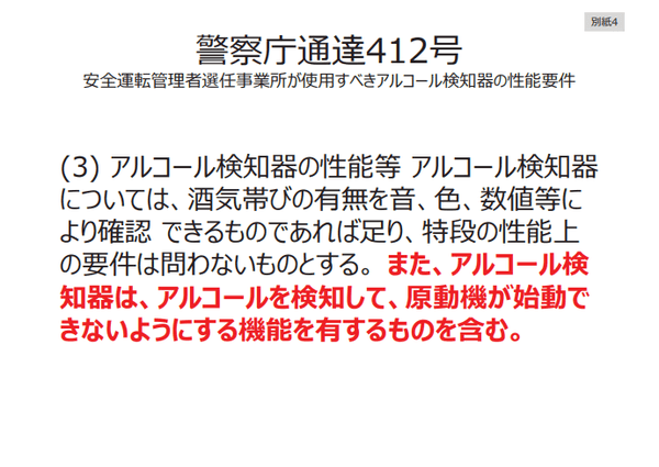 このなかで、アルコールインターロック等、車載タイプも、アルコール検知器の一種であるとされました。(別紙 4)