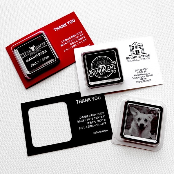 高度で精密な加工を実現させた独自の製法により、多様な画像データをチョコレート上で表現可能となりました。世界中から厳選した最高品質のカカオ豆を使用したベルギー王室御用達ブランド「ベルコラーデ」のチョコレートを採用し、ワンランク上のノベルティアイテムや記念日のプチギフトとしておすすめの一品です。