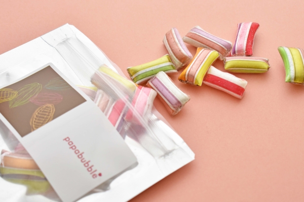 パパブブレの定番フルーツキャンディにチョコレートを合わせました。ココアパウダーが入ることでチョコレートの濃厚な味わいとフルーツの酸味が絶妙にマッチ。職人が何度も調整を重ねた自信作です。