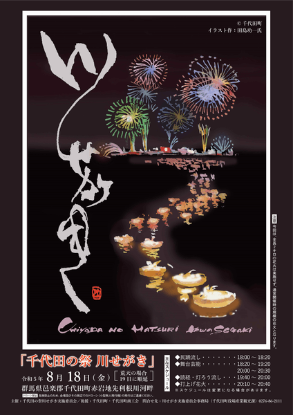 千代田町は利根川中流域に面した平坦で水と緑が豊かな町。「川せがき」は、水難者供養のための僧侶による読経・灯ろう流し、舞台芸能に加え、利根川河川敷から打ち上げられる花火を間近に感じることのできるお祭りです。