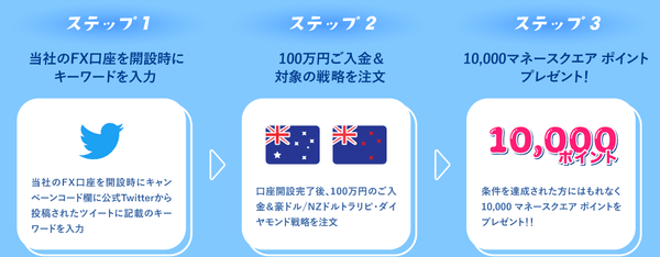 FXの新規口座開設時に当社公式Twitterアカウントで公開中のキーワードを入力いただき、口座開設後に100万円以上の入金&対象のトラリピ戦略をご注文いただくと、もれなく10,000マネースクエア ポイント※をプレゼントいたします。