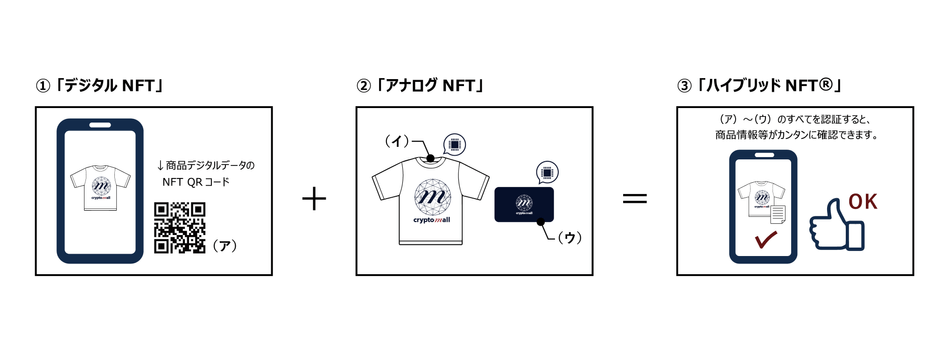 「ハイブリッドNFTマーケットプレイス(R)」とは、マーケットプレイス上で物理的商品(=「アナログ財」)を購入すると、当該商品の「デジタルNFT」が自動的に付与され、「真贋証明」および 「サプライチェーン(トレーサビリティ)」を100%担保した状態で、お手元に物理的商品が届くという全く新しい形式のショッピングモールです。