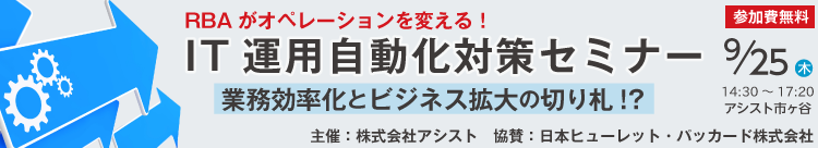 アシスト、日本ヒューレット・パッカード 共催セミナー 9月25日、IT運用自動化対策セミナー 開催のご案内 RBAがオペレーションを変える!<< IT運用自動化対策セミナー >> ~業務効率化とビジネス拡大の切り札!?~