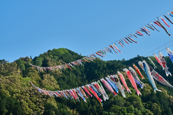 山が新緑に染まる4月~5月、四万十川では色とりどりの鯉のぼりが、川面を渡る風をうけて悠然と泳ぐ姿が見られる