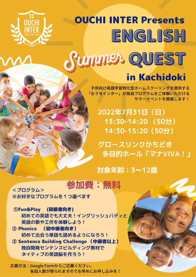英語学習特化型ホームスクーリングの「おうちインター」、7/31(日)グロースリンクかちどきにてサマーイベントを開催!