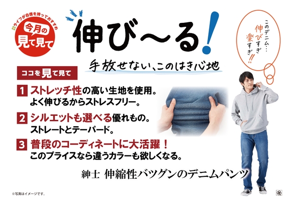“おいしい” “ワクワク” “ハッピー” をお届けするライフコーポレーションは、「紳士 伸縮性バツグンのデニムパンツ」を、1月に近畿圏店舗で新発売いたしました。