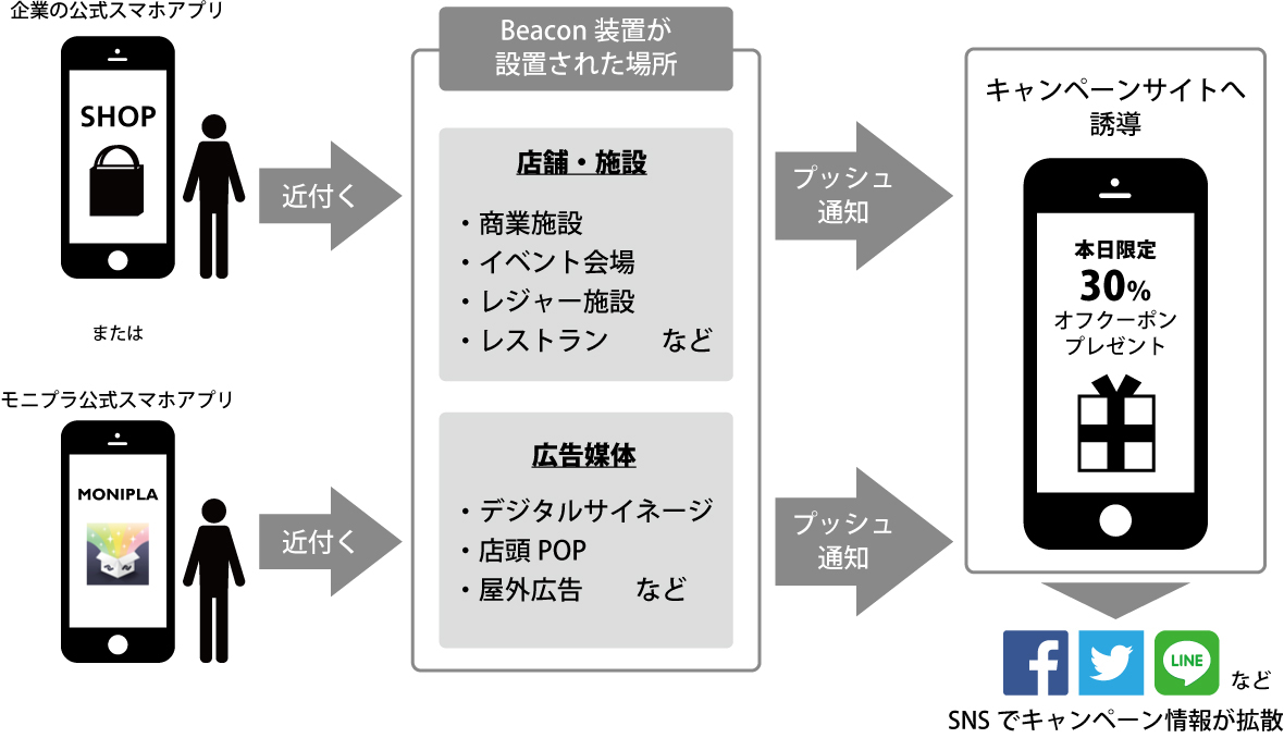 アライドアーキテクツが提供するキャンペーン支援プラットフォーム「モニプラ」と、ACCESS社が提供するBeaconソリューション「ABF」が連携したサービスで、店舗や広告・販促物などに「Beacon」装置を組み込むことで、アプリを通じてユーザーをキャンペーンサイトへ誘導することができます。