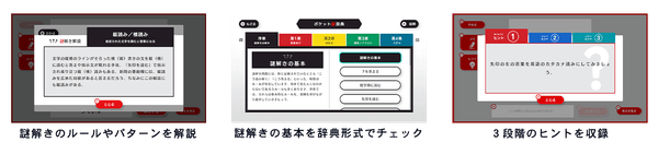 まずは謎解きのルールやパターンについて学ぶことができる機能です。謎解き後に解説を読むことができる「謎解き解説」と、辞典形式で好きなときにチェックすることができる「ポケット謎辞典」。いずれもSCRAP出版より販売中の『SCRAP presents 謎図鑑』の内容を一部抜粋し収録しています。「たぬき問題」「クロスワード」など馴染みのあるものから、謎解きの考え方のコツまで幅広くカバーしており、初心者の方が基礎を学ぶ際にも、知識を蓄えて成績アップを狙う際にも役立ちます。