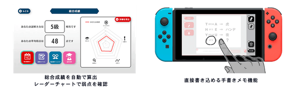 さらには、サポート機能である「成績」モードで、プレイ履歴から算出する目安級とともに、ジャンル別の成績がレーダーチャートで表示。自分のレベルと弱点を把握して、より上の成績を目指すことができます。