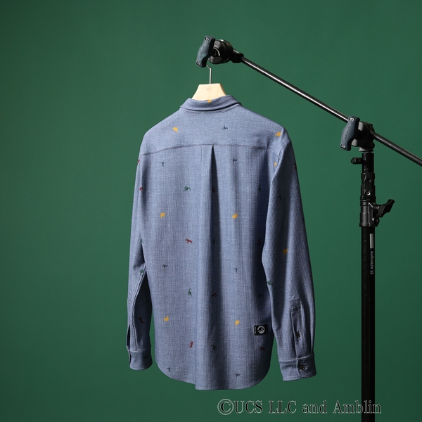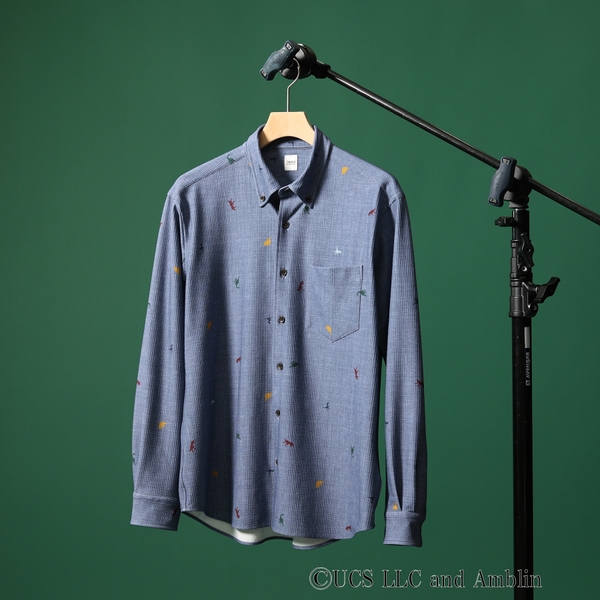 劇中に登場する恐竜のシルエットを飛び柄のプリントでちりばめたボタンダウンシャツ。さりげないアクセントは、プレッピーな雰囲気で品良く着こなせます。シアサッカー素材は肌離れもよく、夏の軽羽織~秋口のシャツとして使いまわしの効く1枚。同素材のショーツ(931-75355)も展開。