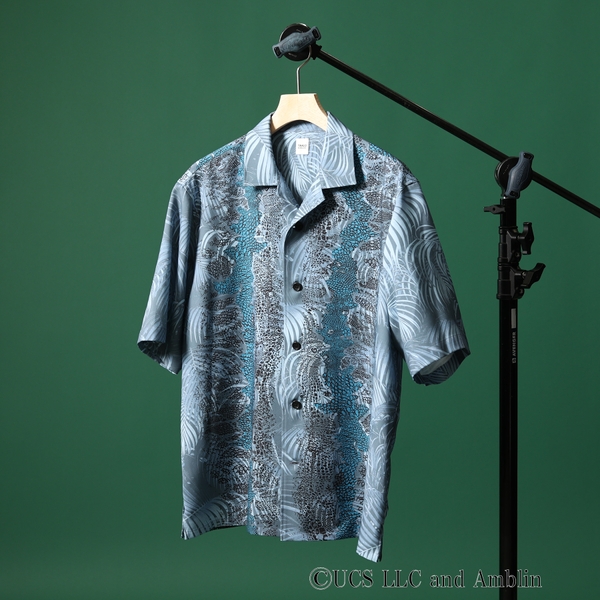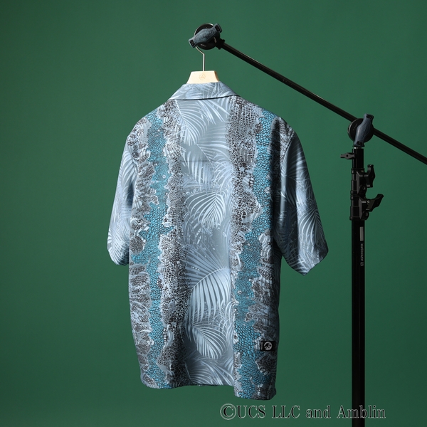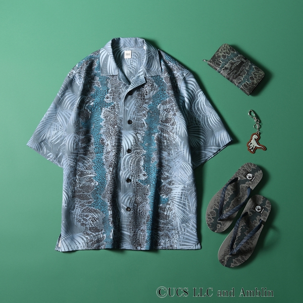 劇中に登場するヴェロキラプトルの「ブルー」をイメージしたカラーリングと、ジャングル感漂うリーフ柄を表現した開襟シャツ。同素材のショーツ(931-75356)とセットアップでの着用も可能です。