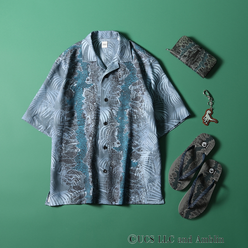 今回は「大人が品良く着こなせるコラボレーション」をテーマに、ヴェロキラプトルの「ブルー」をイメージしたカラー&パターンの夏にぴったりなオープンカラーシャツ&ショーツのセットアップ、革小物など全7点をラインナップ。