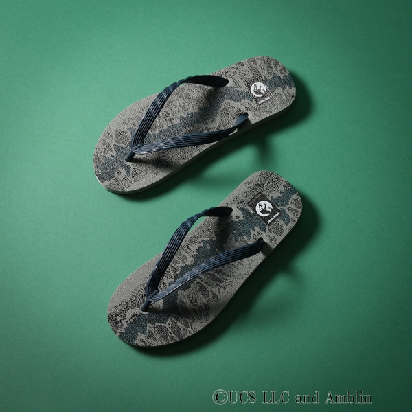 劇中に登場するヴェロキラプトルの「ブルー」をモチーフにしたラプトルスキン柄のビーチサンダル。縦に走るブルーのラインがインパクトのあるデザインになっています。サイズはワンサイズ展開(27cm相当)
