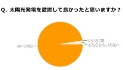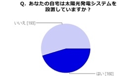 Q.あなたの自宅は太陽光発電システムを設置していますか?再生可能エネルギーが注目を集める中、最も身近な自然エネルギーとして人気を博している太陽光発電システム。一般的な一戸建ての導入価格が150万円~200万円と、決して安い買い物ではない太陽光発電システムだが、設置後のユーザーの満足度はいかがなものだろうか。