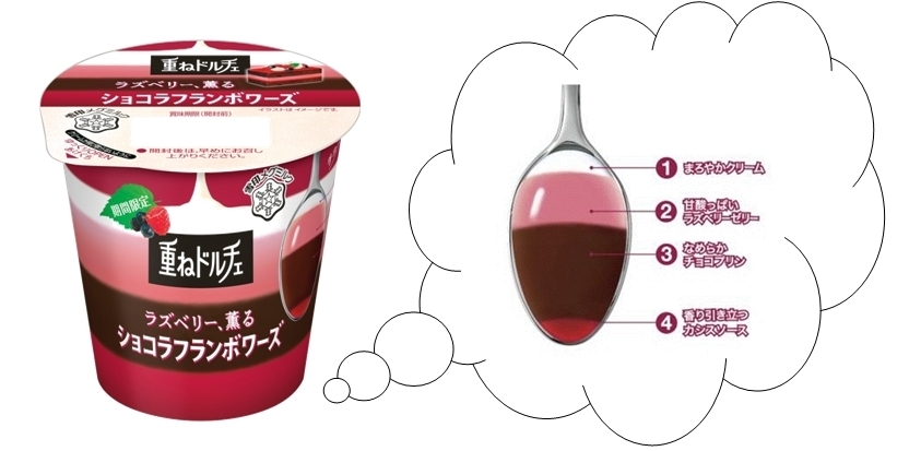 『重ねドルチェ ラズベリー、薫る ショコラフランボワーズ』「重ねドルチェ」は、雪印メグミルク独自の特許製法※によりつくられた、魅力的な味わいと口どけを4層に重ねたデザートです。