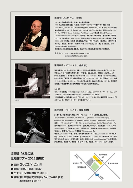 北海道 東川町は、9月25日(日)に東川町複合交流施設せんとぴゅあⅠ講堂にて、「坂田 明『水晶の詠』北海道ツアー2022」を開催いたします。