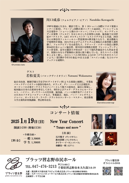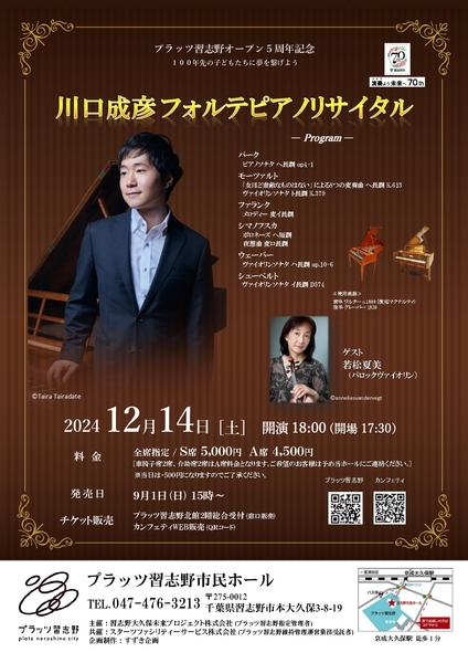 習志野大久保未来プロジェクト株式会社主催、プラッツ習志野オープン5周年記念特別演奏会 ~100年先の子どもたちに夢を繋げよう~『川口成彦フォルテピアノリサイタル』が2024年12月14日 (土) に習志野市民ホール(プラッツ習志野)(千葉県習志野市本大久保3-8-19)にて開催されます。