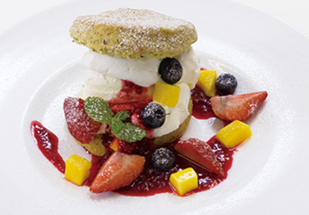 ビスケットには、ジェラートとホイップクリーム、ラズベリーソースをたっぷりとかけ、イチゴ、ブルーベリー、マンゴーを添えたフルーツの甘酸っぱさと絶妙に合う一品です。